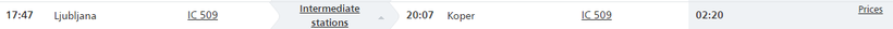Курсирует по маршруту поезд IC 509, который ежедневно отправляется с ж/д вокзала Любляны в 17:47 и за 2 ч. 20 мин преодолевает свой путь до Копера.
