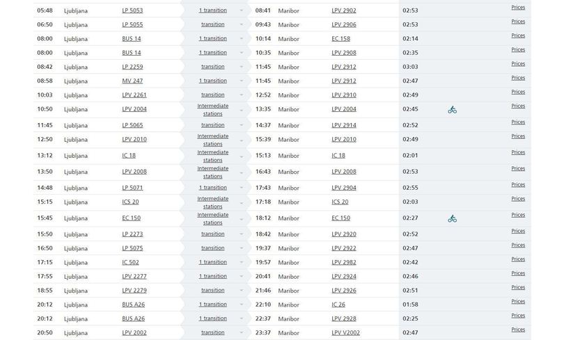 Как я уже говорил, железнодорожные и автобусные вокзалы находятся по соседству в обоих городах, поэтому сразу перейду к рассмотрению расписания. Для этого предлагаю зайти на сайт железных дорог Словении. Вот скриншот оттуда: