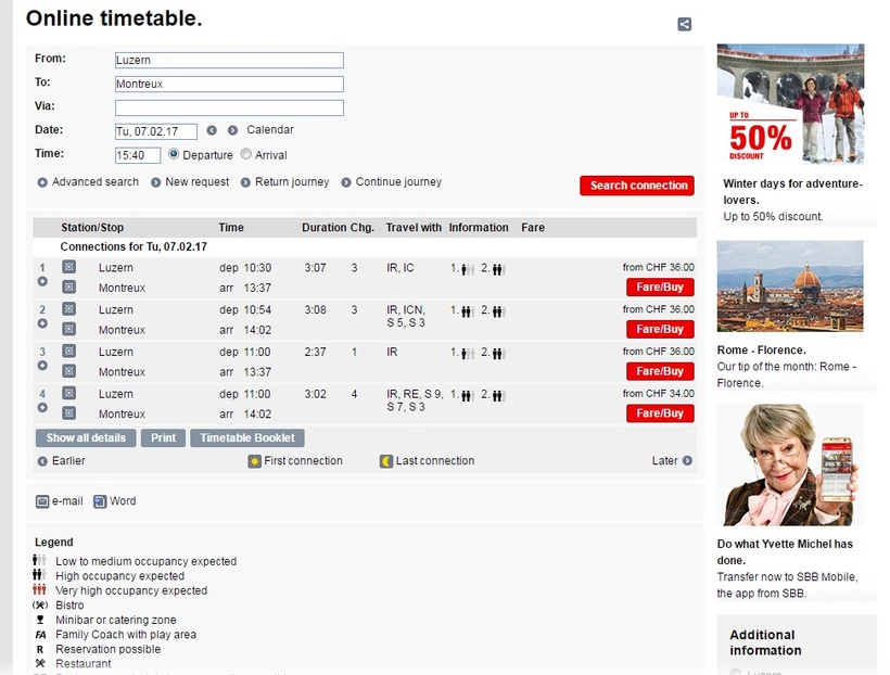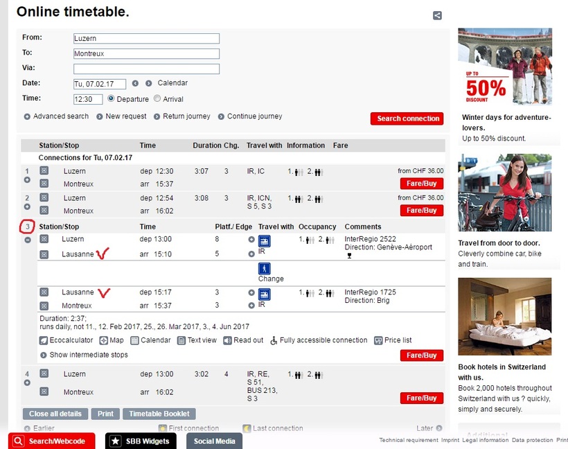 Теперь о расписании поездов из Люцерна в Монтре. Прямых рейсов, к сожалению, нет. Путешествовать придется минимум с одной пересадкой. Некоторые рейсы предусматривают три и даже четыре пересадки. Вот фрагмент расписания с сайта швейцарских железных дорог (SBB).