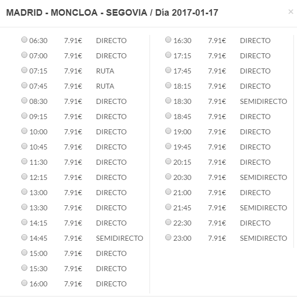 Отправка всех автобусов в Сеговию проходит с автобусной остановки Moncloa (Calle Princesa, 89), начиная с 06.30. Все автобусы ходят с интервалом от пятнадцати минут до сорока пяти, а последний автобус отправляется в 23.00.