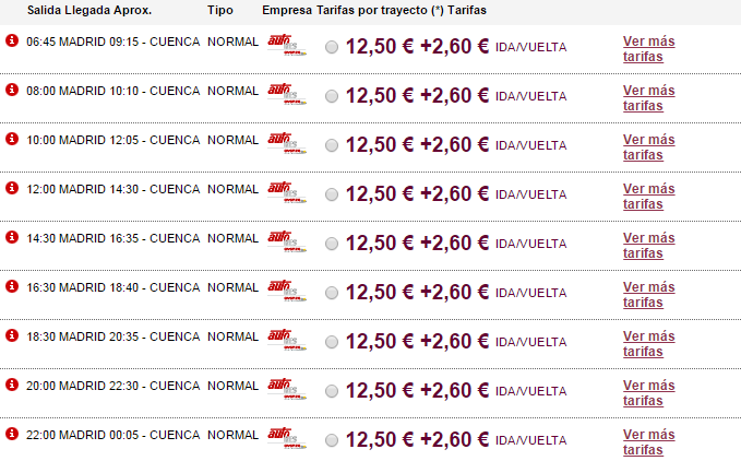 Ниже приведена информация о том, сколько часов вам потребуется, чтобы добраться от Мадрида до Куэнки, а также приведена примерная стоимость проезда (средняя цена билета) на том или ином виде транспорта.