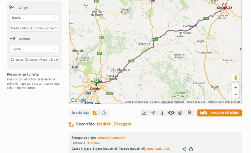 Расстояние между Мадридом и Сарагосой составляет 170 километров или 106 миль по прямой и 314 километров или 195 миль по автодорогам.