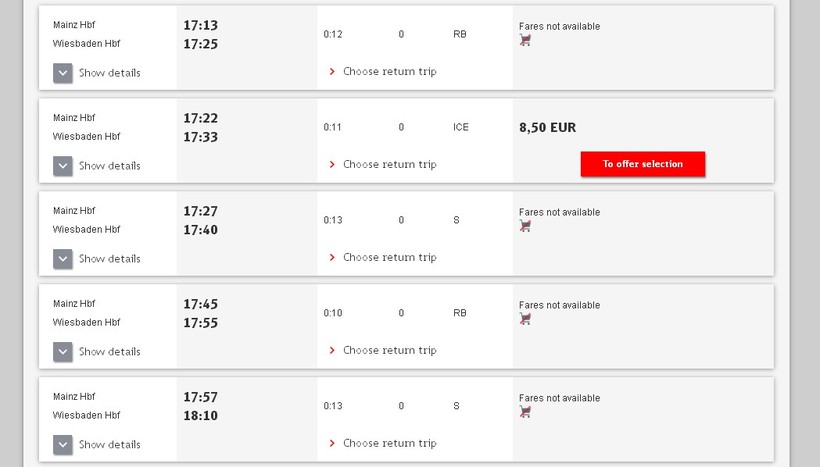 Расписание вы можете посмотреть на сайте Немецкие железные дороги, заодно там написано с какой платформы отправляется интересующий вас рейс, нужно только нажать «Show details». Поезд ходит по будням с 6:00 до 21:15, по субботам с 7:00 до 19:00, по воскресеньям с 8:00 до 20:00. Еще полезную информацию о поездах в Германии советую почитать здесь.