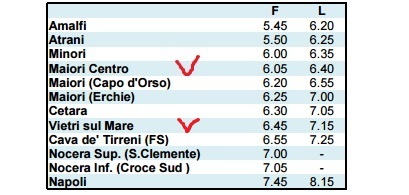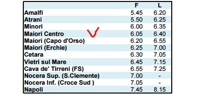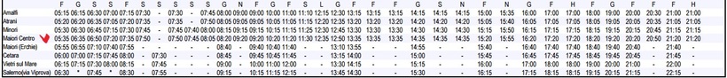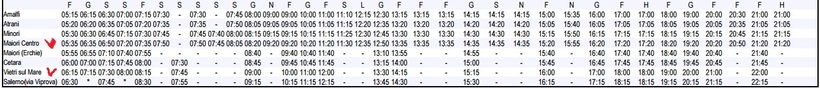 Путешествие из Майори в Помпеи можно осуществить по комбинированному маршруту на автобусе и поезде. По времени такая поездка займет 1 час 40 минут. Если выберете этот вариант, то Вам необходимо с автостанции Maiori Centro на автобусах №5120 или 5020 доехать до остановки Vietri sul Mare. Ниже, в расписании я отметила эту остановки отправления и прибытия красным маркером.