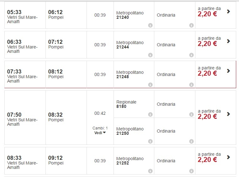 Поездку можно осуществить как прямым рейсом, так и с пересадкой в Cava De' Tirreni. По стоимости и по времени оба маршрута друг от друга практически не отличаются, Поезда в Помпеи отправляются ежедневно с 05.33 до 21.03 через каждые 30-60 минут.