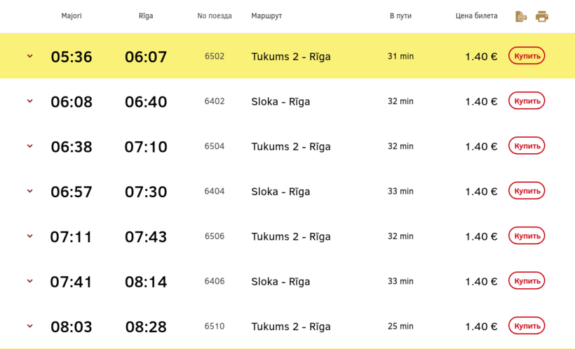 Кроме автобусов, между столицей и Майори еще ходят и электрички. Отправляются они с железнодорожной станциии, которая расположена рядом с автовокзалом (на карте это хорошо видно). С расписанием можно ознакомиться на сайте латвийских железных дорог. Вот скриншот оттуда: