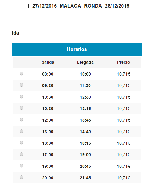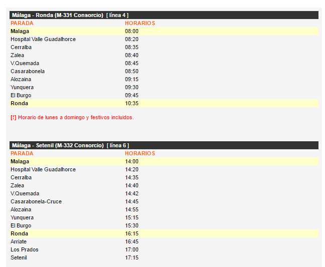 Отправка абсолютно всех автобусов происходит с автобусной станции Малаги - Paseo de los Tilos, s/n. Прибытие в Ронду на автобусную станцию - Plaza Concepcion Garcia Redondo 2. Автобусы едут в среднем два с половиной - три часа.