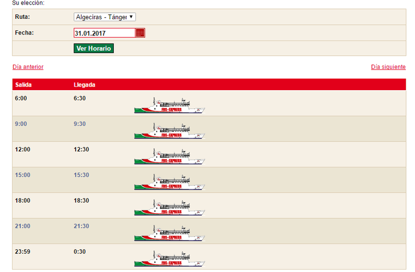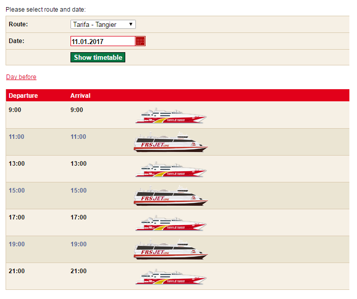 - Из испанской Тарифы в Танжер курсируют ежедневно с интервалом в два часа паромы компании FRS, начиная с девяти утра и до девяти вечера.