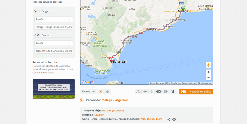 Примерный маршрут выглядит так. Вам нужно выехать из Малаги на автостраду АР-7 и следовать по ней аж до Альхесираса. Как видите, заблудиться просто негде.