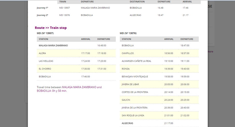 В Альхесирас можно добраться и на поезде, правда, этот вариант не самый удобный. Электричка отправляется из Малаги в 16:48, прибывая в Альхесирас в 21:17. Таким образом, маршрут не самый удобный, тем более что приходится делать пересадку и почти час сидеть на промежуточной станции в ожидании своего поезда.
