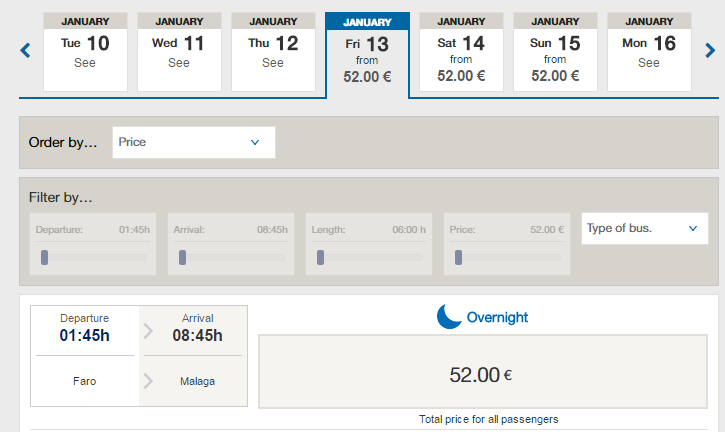 К сожалению, прямое автобусное сообщение между Фаро и Малагой поддерживают далеко не все местные автобусные компании и мне пришлось немало потрудиться, чтобы найти возможные варианты переезда. Одной из компаний, имеющих прямое транспортное сообщение между городами, является Alsa. Автобус отправляется из Фаро один раз в сутки в 1.45 ночи и прибывает в Малагу в 8.45.