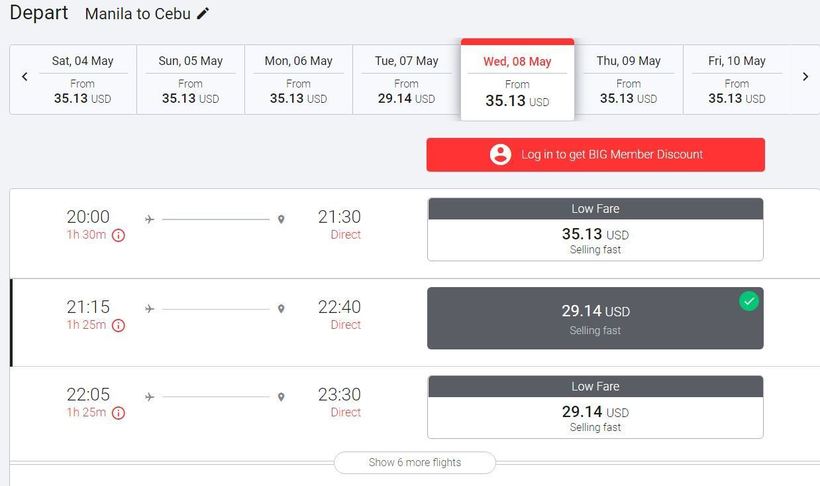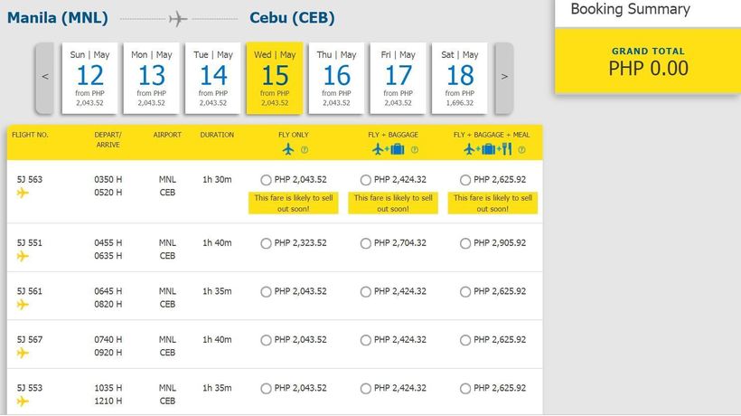 Авиарейсы в данном направлении предлагают 3 авиакомпании. Первой в списке я могу назвать Cebu Pacific. Вот скриншот с её сайта: