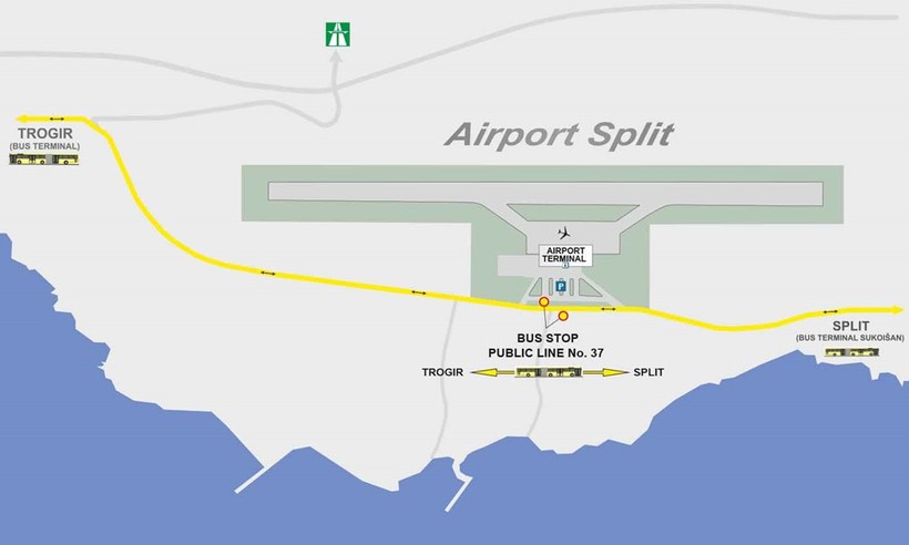 Специальные автобусы-шатлы. Поездка длится 30 минут, автобус прибывает на Главный автовокзал города Сплит, поблизости от Старого города. Время отправления автобусов — 20 минут после приземления каждого рейса. Автобусы прибывают на платформу № 1 автовокзала (находится рядом с портом). Стоимость проезда составляет 60 КУН (8,12 EUR). Билет можно забронировать и оплатить (кредитной картой) заранее через сайт.
