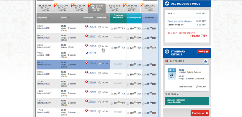 Turkish Airlines предлагает пассажирам рейсы из обоих аэропортов Стамбула, поэтому при покупке билетов будьте внимательны. Аэропорт имени Ататюрка и аэропорт Сабиха Гекчен расположены на разных берегах Босфора очень далеко друг от друга, поэтому настоятельно рекомендую вылетать в Даламан из того же аэропорта, в который вы прилетели из дома. В воздухе нужно будет провести час и 15-20 минут.