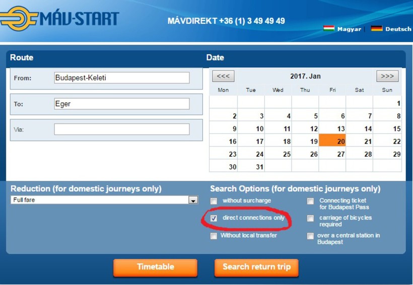 Красным кружочком обведена птичка, которая дает возможность выбрать прямые рейсы из Будапешта в Эгер. Если ее убрать, то поисковик Вам выдаст как прямые, так и рейсы с пересадкой. Все прямые рейсы осуществляются поездами второго класса. Рейсы с пересадкой могут осуществляться поездами первого и второго класса. Первый класс отличается от второго наличием более мягких и широких сидений. Пассажиров в таких вагонах намного меньше, так как их стоимость почти вполовину дороже второго класса.