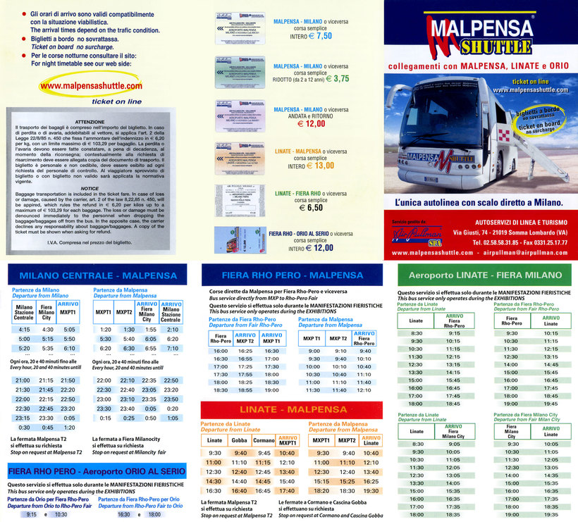 Эти автобусы ходят не часто, потому что нет большой необходимости, поэтому их расписание лучше уточнять на сайтах «Malpensa shuttle» и «ORIO SHUTTLE» «ORIO SHUTTLE».