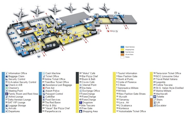 Ближайший аэропорт от Ливорно находится в 20-ти километрах от города, но относится уже к Пизе, это аэропорт имени Галилео Галилея. В нем 2 этажа, но все сосредоточено на первом. Здесь можно вызвать такси, купить билет на автобус и поезд, взять на прокат машину. Рядом есть большая парковка и автобусная остановка.