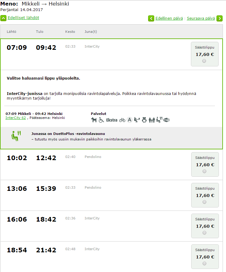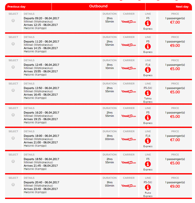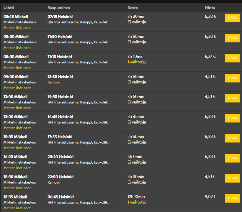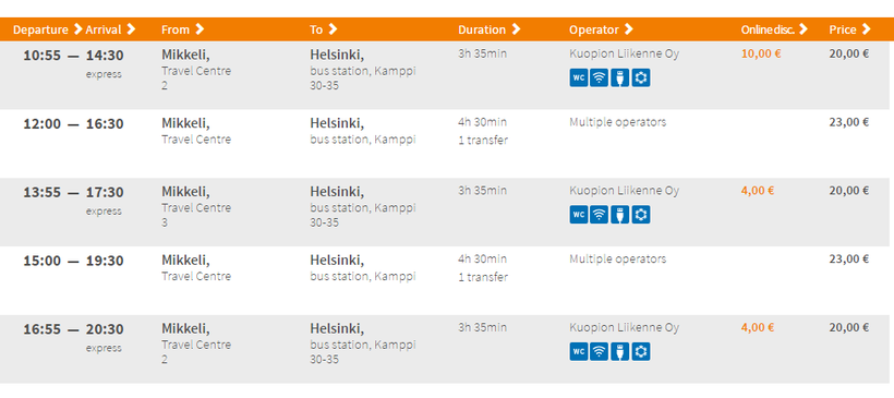 Когда планировала свой маршрут из Миккели в Хельсинки, то остановилась на следующих перевозчиках: