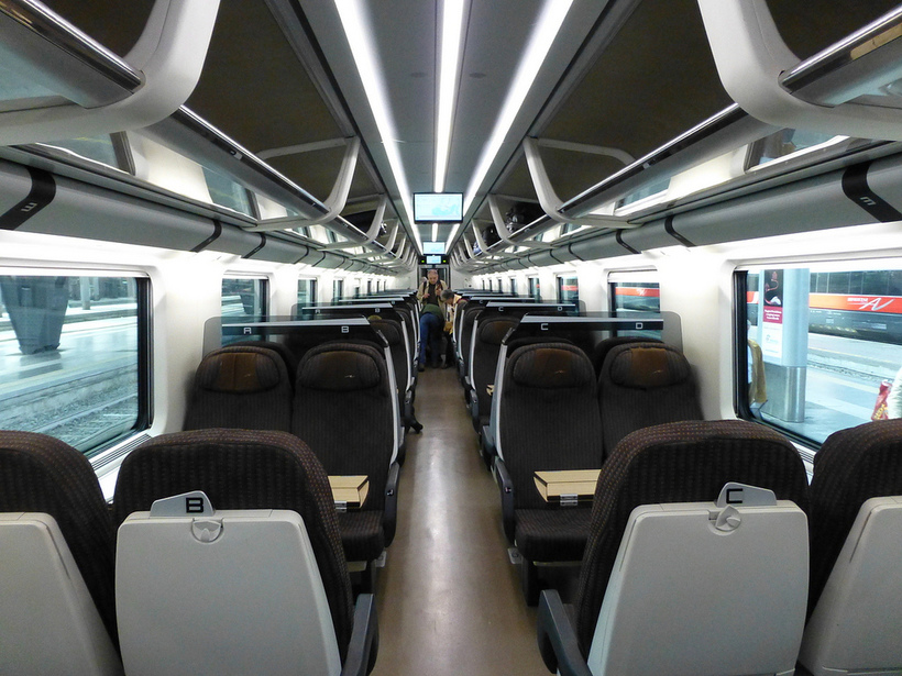 От миланского вокзала Порта Гарибальди (Piazza Sigmund Freud, 1) до парижского Gare De Lyon (Place Louis Armand) пять раз в день ходят прямые поезда. Первый – в шесть часов утра. За семь с половиной часов вы окажитесь в столице Франции. Вот так выглядит класс Стандарт подобного поезда: