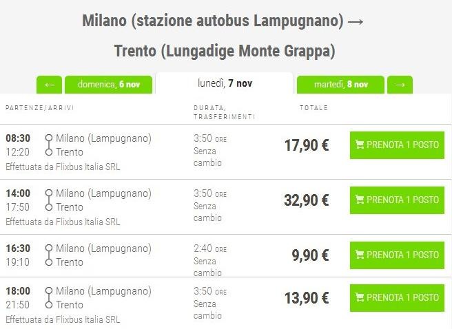 Автобусом легко добраться до Тренто, а ниже я напишу, как от Тренто доехать до Мадонны ди Кампильо. По понедельникам, пятницам, субботам и воскресеньям компания Flixbus совершает 4 прямых рейса до Тренто: в 08:30, 14:00, 16:30 и в 18:00. По вторникам, средам и четвергам расписание почти такое же, только отсутствует рейс в 16:30. Автобусы оснащены туалетами, розетками и бесплатным интернетом, поэтому провести в дороге 2:40-3:50 часов совсем не обременительно. Отправляются автобусы от автовокзала Lampugnano в Милане (на Via Giulio Natta), прибывают в Тренто на автостанцию (на Lungadige Monte Grappa).