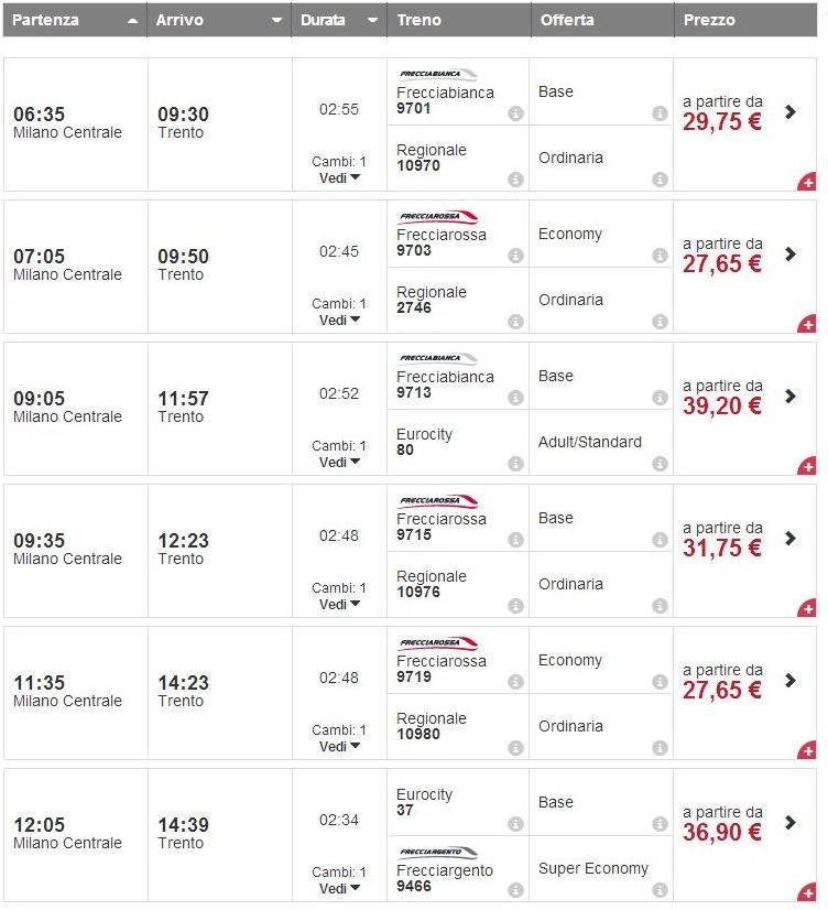 В Мадонне нет железной дороги, поэтому добираться нужно через Тренто. Ежедневно с 06:35 до 20:35 составы Frecciabianca, Regionale, Frecciarossa, Eurocity и Frecciargento отправляются с вокзала Milano Centrale (на Piazza Duca d'Aosta, 1). Об их особенностях можно узнать в этой статье. Все поезда доезжают до Тренто (вокзал находится на Piazza Dante). Интервал между отправлениями – от 30 мин до 2 ч, а в дороге до Тренто придется провести в среднем 2,5-3 часа, учитывая пересадку в Вероне. Зимой расписание обычно меняется, становится меньше рейсов в сутки, поэтому лучше всего смотреть нужные даты на сайте.