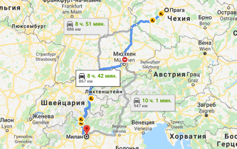 Дорога из Праги в Милан может лежать через территорию Германии и Швейцарии или через Австрию. Рекомендую выбрать путь через Германию и Швейцарию, он быстрее. Этот вариант маршрута проходит: