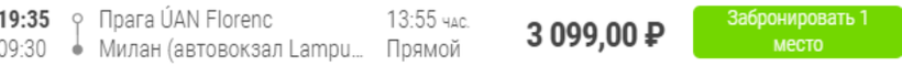 Автобусы отправляются от автовокзала Prague Florenc, расположенного на Křižíkova 6, в 19:35 и путь до Милана преодолевают за 14 часов.