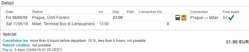 Кроме автобусов FlixBus, по пятницам по маршруту Прага — Милан следуют прямые рейсы чешской компании Student Agency. Отправляются они из Праги в 23:00, за 14 часов доезжают в Милан.