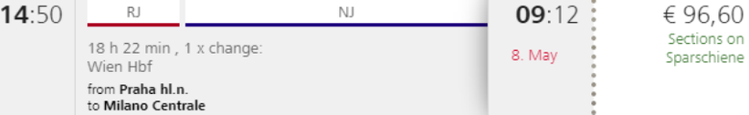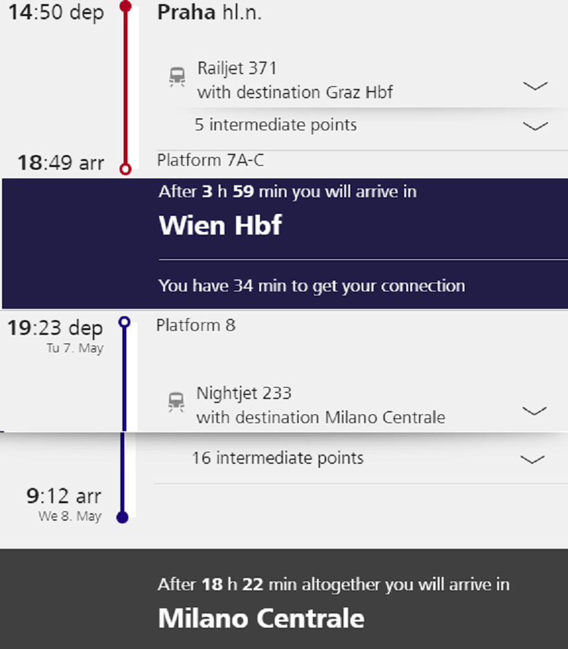- отправление из Вены в 19:23 и прибытие в Милан в 09:12.