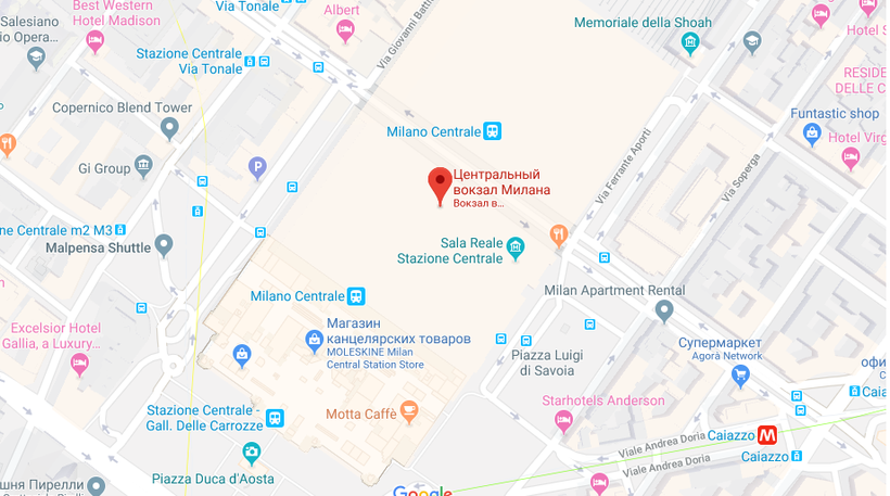 Прибывают поезда в Милан на станцию Milano Centrale на Piazza Duca d'Aosta, 1.