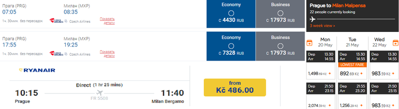 Полет на самолете из Праги в Милан длится примерно 1 час 25 минут.