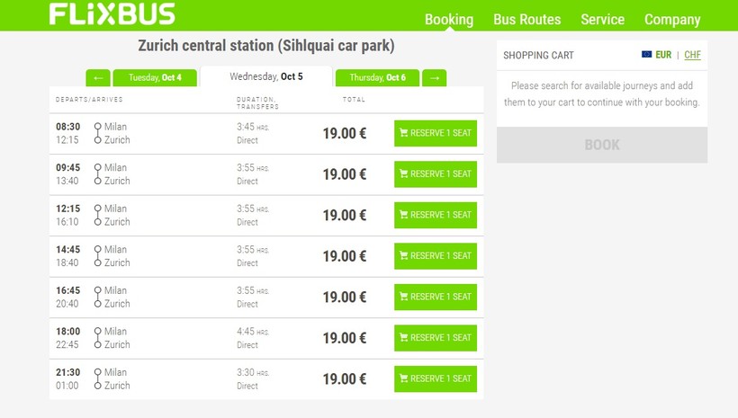 Оба рейса отправляются из Милана с автостанции Lampugnano, в Цюрих автобус прибывает к железнодорожному вокзалу Sihlquai, в Женеву - на Place Dorcière, что тоже недалеко от центрального вокзала.