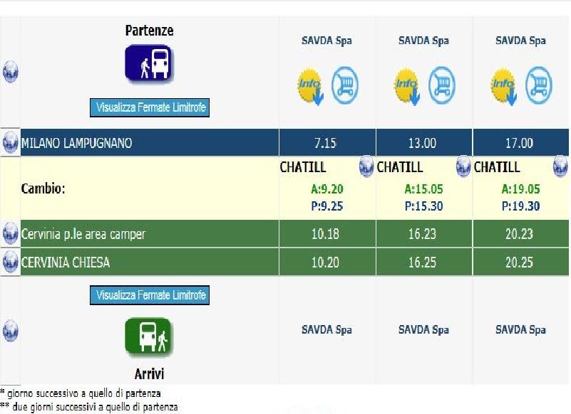 Доехав до Chatillon Saint Vincent поездом, нужно пересесть на автобус фирмы Savda. Его остановка находится на кругу возле улицы Via Robert Pellissier. Она не так уж и близко расположена от железнодорожного вокзала (около километра пешком). Всего есть 5 рейсов в сутки до Червинии: в 9:25, 11:30, 14:15, 15:30 и 19:30. Автобус довезет вас до конечного пункта (на Via Guido Rey) за 55 минут.