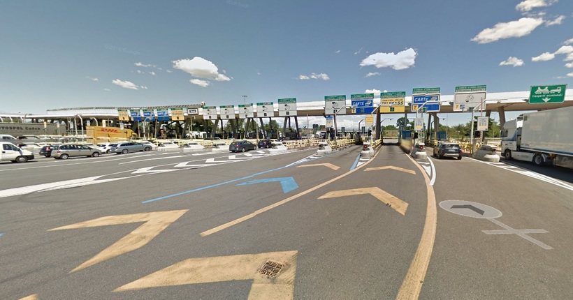 Шатийоне нужно выехать на Е25/А5, она платная, на въезде расположены автоматы, где нужно взять билет. Можно продолжать ехать по SS26, но дорога значительно хуже и ехать будете дольше. Недалеко от Ivrea Е25 поворачивает в сторону Милана, а А5 идет в Турин. Нужно на круговой развязке повернуть на Е25, немного проехать и повернуть на А4. Дорога все еще платная, качество асфальта отличное, при подъезде в Милан вы увидите такой пропускной пункт:
