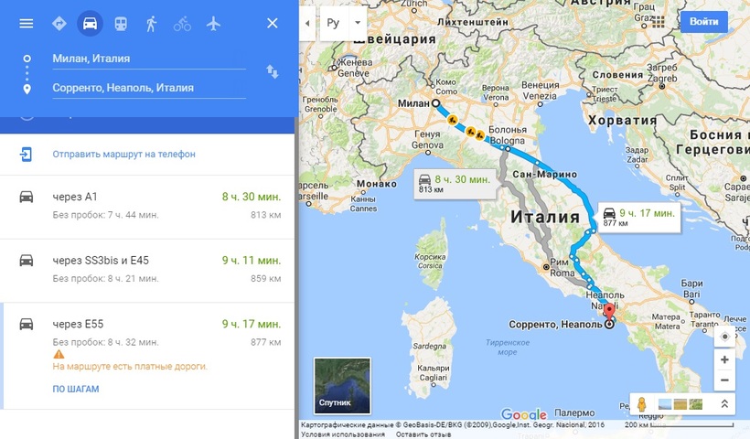 2. По дорогам A1, A14/E45, E55 и A24 вдоль восточного побережья, далее по A25/E80 и по SS145 в сторону Неаполя и Сорренто. Эта дорога немного длиннее, около 877 км.