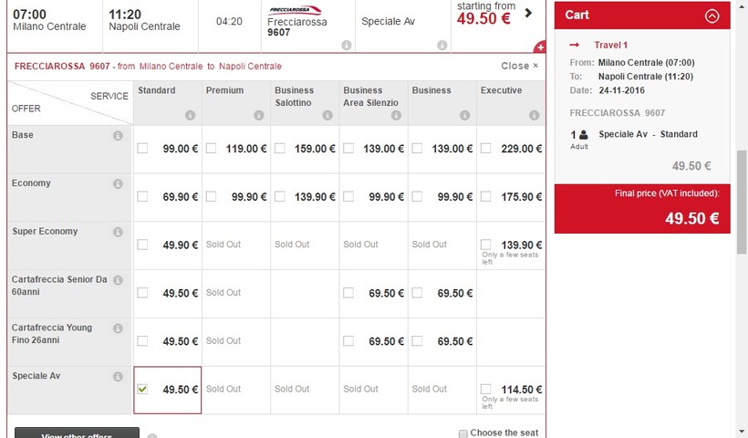 Из Милана до Неаполя, в основном, курсируют поезда категории Frecciarossa, стоимость проезда по этому маршруту стартует от 45,5 евро и до 229 евро, все зависит от класса вагона, но переплачивать нет смысла, на мой взгляд:)