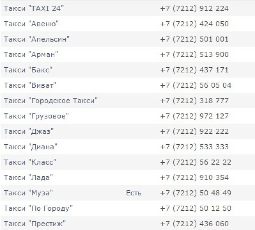 Как потом я узнала, в Казахстане подача такси пассажиру с опозданием чуть ли не традиция :). На это многие местные жители даже не обращают внимание. Но опоздание нашего такси оказалось только «цветочком». Настоящий сюрприз нас ожидал при въезде в Караганду. Наш водитель машины не знал, где точно находится нужный нам адрес! Я это поняла, когда на одной из улиц он остановил машину возле стоящего у обочины такси и стал о чем-то спрашивать у своего коллеги на казахском языке. По жестам второго водителя я поняла, что он объясняет нашему таксисту маршрут поездки. Кошмар! По пути мы еще раз останавливались с целью уточнить дорогу и с горем пополам все же доехали до необходимого адреса. В общем, обслуживанием такси в Караганде я осталась недовольна. Возможно, нам просто не повезло со службой такси, услугой которой мы воспользовались не по своей воле. Дабы Вы не оказались в подобной ситуации и могли самостоятельно заказать подобную услугу, ниже я разместила контактные данные некоторых такси города.