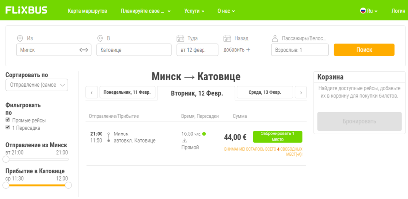 Есть один прямой рейс по вторникам, пятницам и воскресеньям, который выполняет перевозчик Flixbus. Отправление в 21:00 c Центрального автовокзала Минска, который располагается по адресу ул. Бобруйская, 6-1. Ехать придется долго (около 17 часов), но преимущество этого способа в том, что он недорогой и без пересадок. Загрузил багаж, уселся, и можно расслабиться. Прибывают автобусы на автостанцию Катовице (ul. Piotra Skagi, 1).