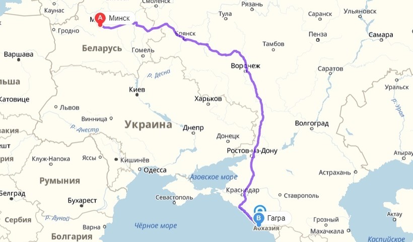 Расстояние по этому маршруту приличное — 2200 километров по трассе. Только однажды я решилась поехать из Минска в Гагру на своей машине. Остановку на ночлег делала в Воронеже. Это оптимально, потому что от Минска до него аккурат тысяча километров, а это почти половина пути. Пока не забыла, виза гражданам России (до 90 дней) и РБ (до 14 дней) для посещения Абхазии не нужна.