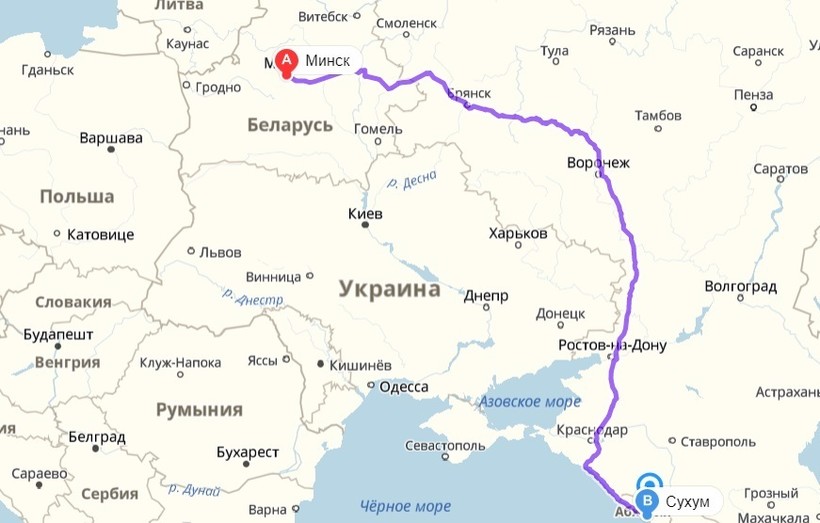 От столицы РБ до города Сухум по трассе 2300 километров. Если еду на машине, то всегда останавливаюсь на ночлег. Для длительного отдыха выбираю или Воронеж, или Ростов-на-Дону, смотря по самочувствию. В этих мегаполисах полно небольших гостиниц, где номер можно снять за 2500 российских рублей в сутки.
