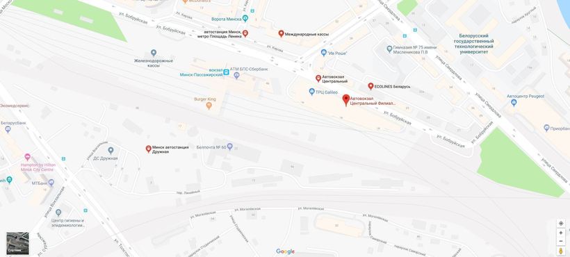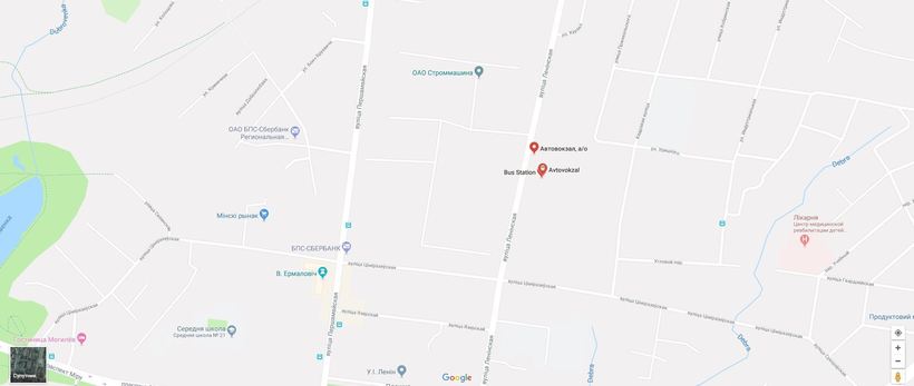 В любом случае, условия на борту вполне соответствующие короткой поездке. Туалета нет, кондиционера, скорее всего, тоже не будет. Сиденья более-менее удобные, багажное отделение в микроавтобусах сравнительно небольшое, так что советую прийти пораньше и первым сдать багаж, пока там еще есть место. Прибывают автобусы на автовокзал Могилева, расположенный вот здесь: