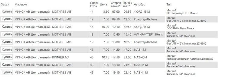 Как видно, минский железнодорожный вокзал располагается по соседству с автовокзалом. Но о поездах речь пойдет ниже, пока что следует разобраться с автобусами. Итак, вот скриншот с расписанием с официального сайта по продаже автобусных билетов: