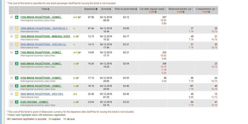 Цена билета стартует от 10 беларусских рублей (чуть больше 4 евро) за место в сидячем вагоне.