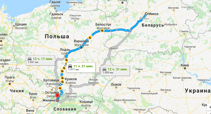 Мой путь из Минска до Жилины по территории Беларуси лежит по дорогам Е30 и Р99. По территории Польши я продолжаю маршрут по скоростным четырехполосным автомагистралям S8 и S1, а по территории Словакии — по двухполосной автомагистрали D3.