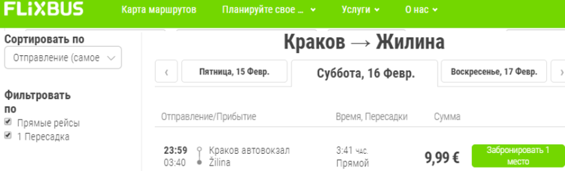 А из Кракова ежедневно в 23:59 отправляется прямой автобус в Жилину компании FlixBus, который свой путь преодолевает за 3,5 часа.