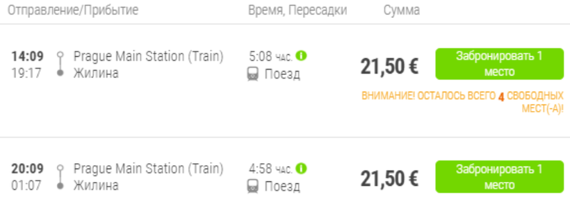 А из Праги ежедневно в Жилину отправляется два прямых поезда в 14:09 и 20:09, которые до Жилины доезжают за 5 часов.