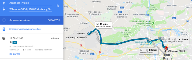 Доехать от аэропорта Праги до ж/д вокзала можно каждые полчаса автобусом за 50 мин.