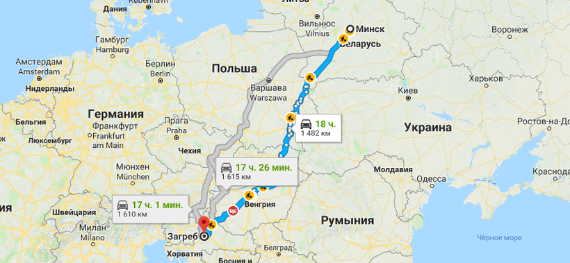 Есть два варианта поездки по маршруту на машине — через Польшу, Чехию и Австрию и через Польшу, Словакию и Венгрию. Я обычно еду по второму маршруту, потому что он короче. Мой путь лежит через такие крупные европейские города, как Люблин, Кошице, Мишкольц и Будапешт, и советую, кстати, на ночлег остановиться в одном из отелей в Кошице, что почти на половине пути к Загребу.