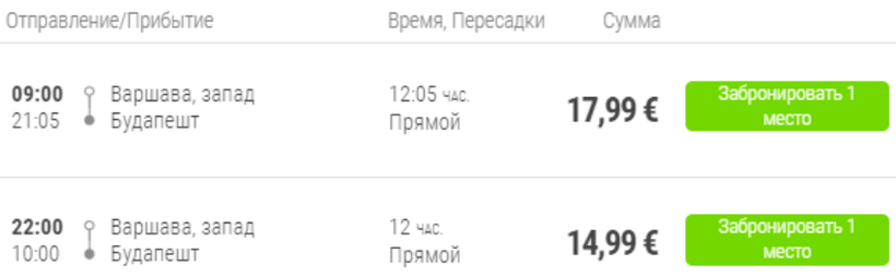 Из Варшавы в Будапешт ежедневно курсирует два автобуса в 09:00 и 22:00, которые до столицы Венгрии доставят за 12 часов.