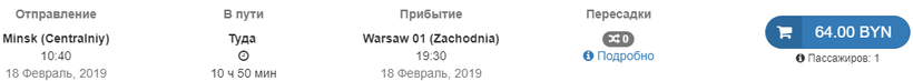 Билет из Минска до Варшавы стоит 64 BYN (26 евро / 1945 руб.).
